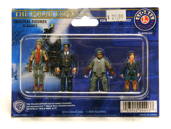 Four Polar Express articulated figures including the Conductor, Hero Boy, Smokey and Steamer for use with O gauge train set.